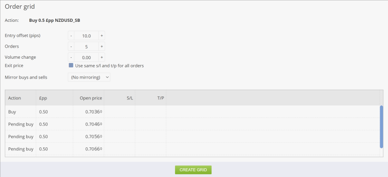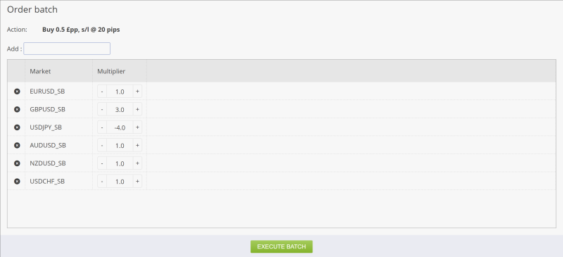 Create batches of orders which execute on multiple markets with a single click, or grids of pending orders above/below the current price.
